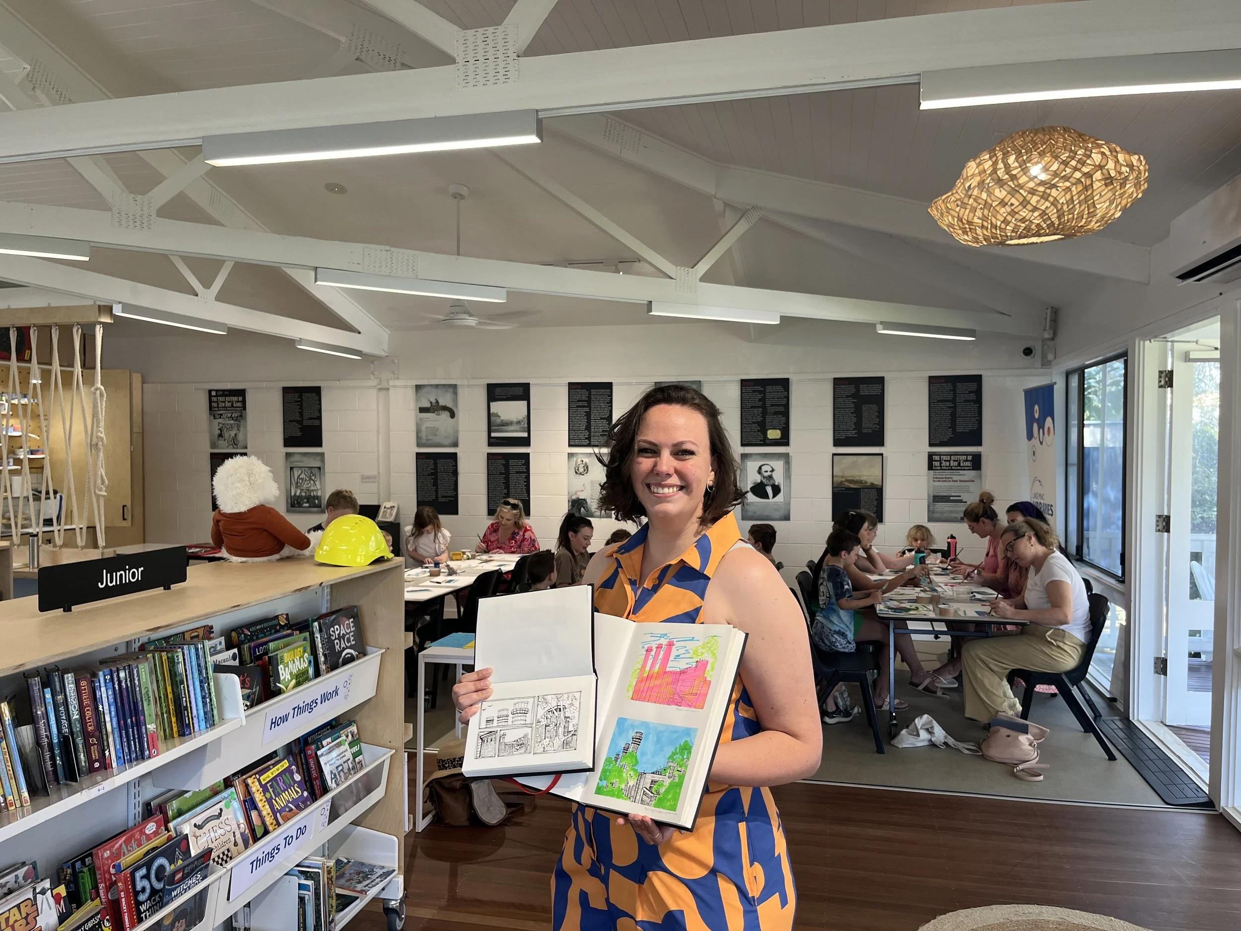 Amy Lees-Doherty standing in the foreground holding two sketchbooks showing artworks. Class of children and adults slightly out of focus doing art behind her. They are inside the Wangi Creative Hub. Children’s books are on display on the left.